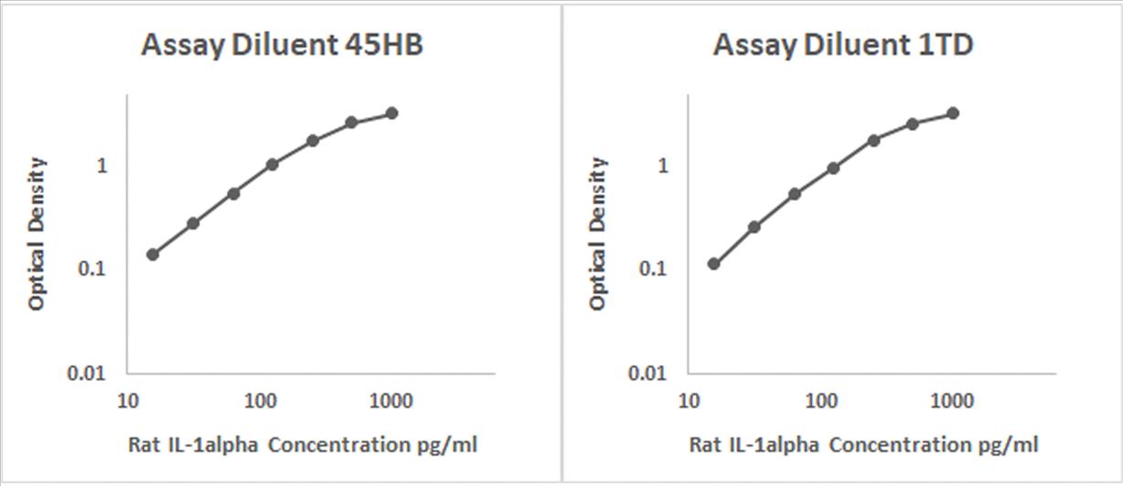 Rat IL-1alpha recombinant protein was spiked into various biological samples and serial diluted with Assay Diluent 45HB for serum and/or plasma samples and Assay Diluent 1TD for RPMI 10% FBS.