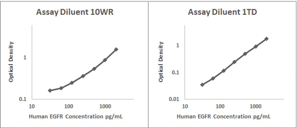 Human EGFR recombinant protein was spiked into various biological samples and serial diluted with Assay Diluent 10WR for serum and/or plasma samples and Assay Diluent 1TD for RPMI 10% FBS.