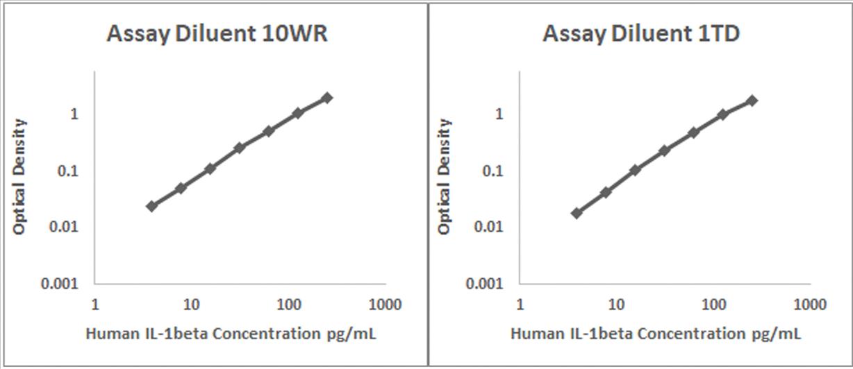 Human IL-1beta recombinant protein was spiked into various biological samples and serial diluted with Assay Diluent 10WR for serum and/or plasma samples and Assay Diluent 1TD for RPMI 10% FBS.