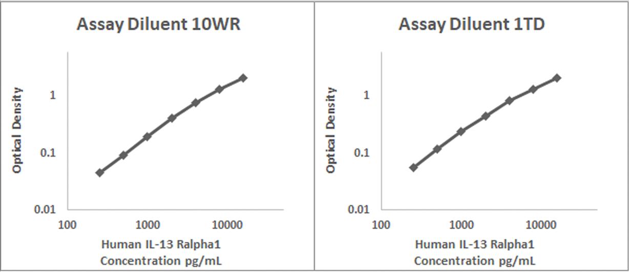 Human IL-13Ralpha1 recombinant protein was spiked into various biological samples and serial diluted with Assay Diluent 10WR for serum and/or plasma samples and Assay Diluent 1TD for RPMI 10% FBS.