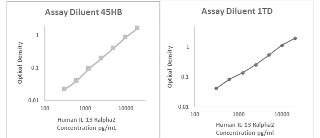 Human IL-13Ralpha2 recombinant protein was spiked into various biological samples and serial diluted with Assay Diluent 10WR for serum and/or plasma samples and Assay Diluent 1TD for RPMI 10% FBS.