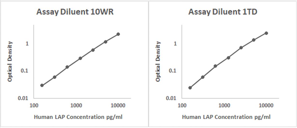 Human LAP recombinant protein was spiked into various biological samples and serial diluted with Assay Diluent 10WR for serum samples and Assay Diluent 1TD for RPMI 10% FBS.