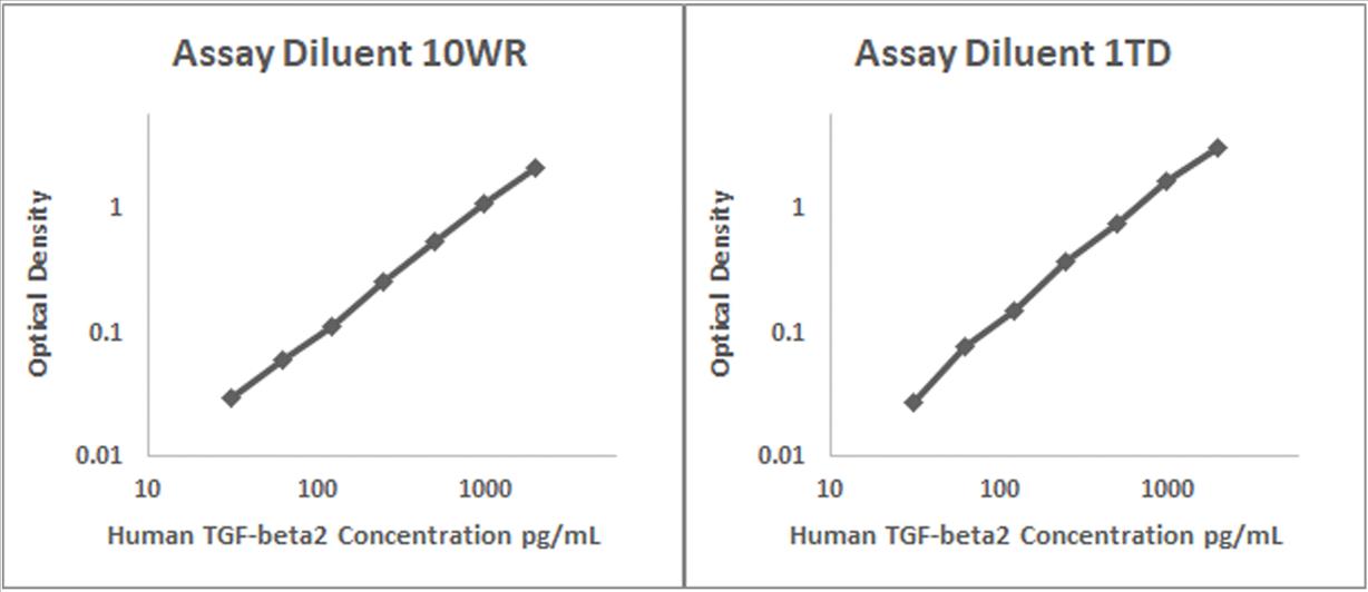 Human TGF-beta2 recombinant protein was spiked into various biological samples and serial diluted with Assay Diluent 10WR for serum and/or plasma samples and Assay Diluent 1TD for RPMI 10% FBS.