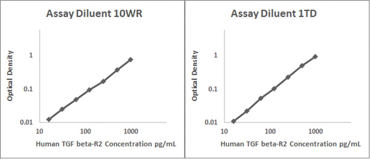 Human TGFbeta-R2 recombinant protein was spiked into various biological samples and serial diluted with Assay Diluent 10WR for serum and/or plasma samples and Assay Diluent 1TD for RPMI 10% FBS.