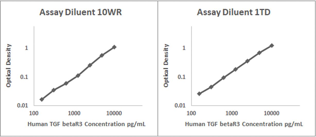 Human TGFbeta-R3 recombinant protein was spiked into various biological samples and serial diluted with Assay Diluent 10WR for serum and/or plasma samples and Assay Diluent 1TD for RPMI 10% FBS.