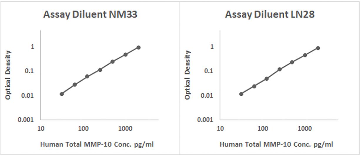 Human Total MMP-10 recombinant protein was spiked into various biological samples and serial diluted with Assay Diluent NM33 for serum and/or plasma samples and Assay Diluent LN28 for RPMI 10% FBS.