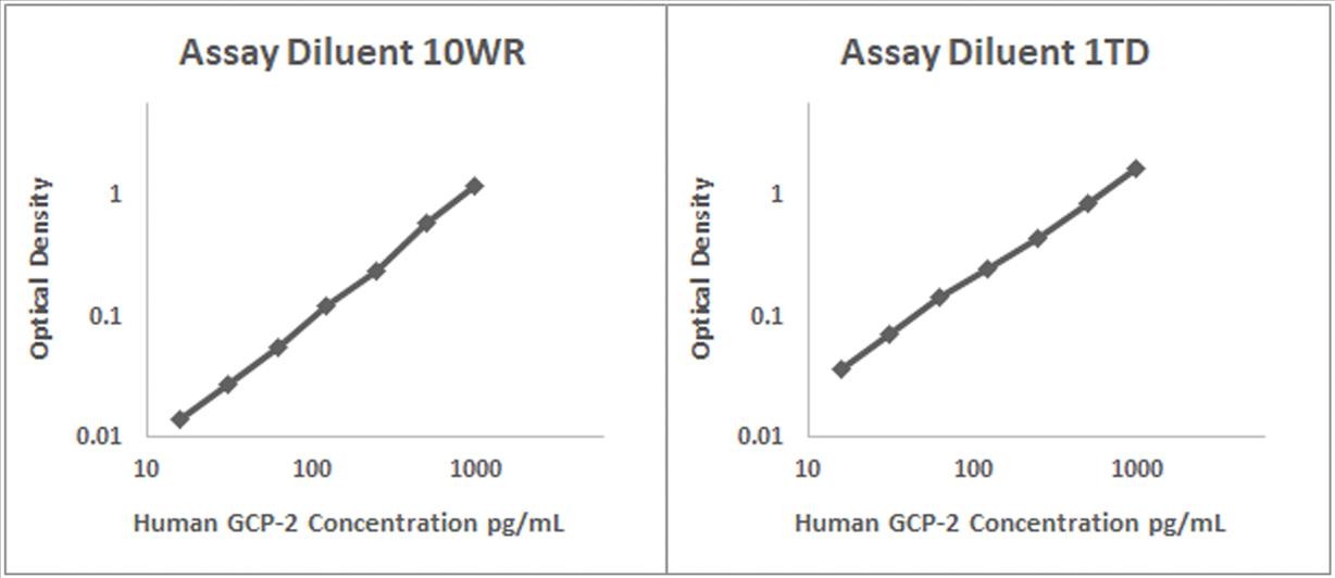 Human GCP-2 recombinant protein was spiked into various biological samples and serial diluted with Assay Diluent 10WR for serum and/or plasma samples and Assay Diluent 1TD for RPMI 10% FBS.