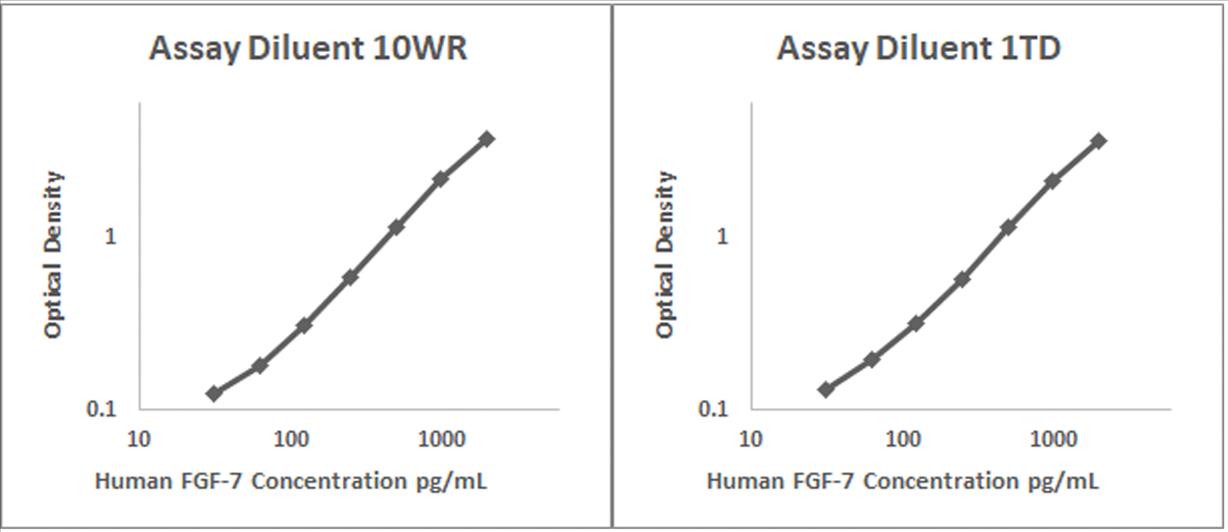 Human FGF-7 recombinant protein was spiked into various biological samples and serial diluted with Assay Diluent 10WR for serum and/or plasma samples and Assay Diluent 1TD for RPMI 10% FBS.