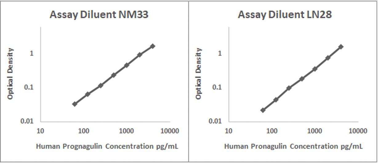 Human Progranulin recombinant protein was spiked into various biological samples and serial diluted with Assay Diluent NM33 for serum samples and Assay Diluent LN28 for RPMI 10% FBS.