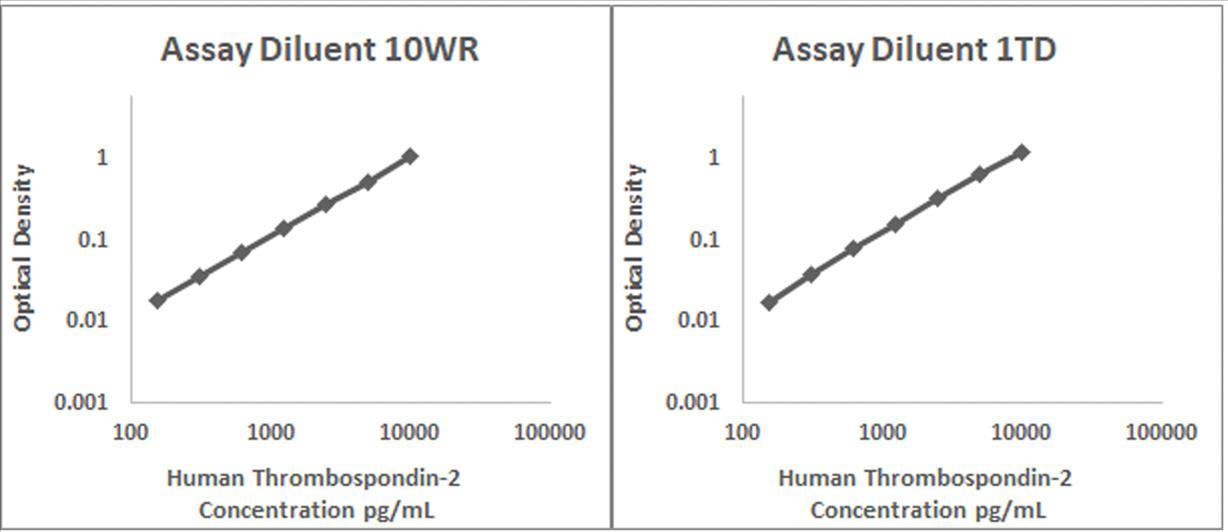 Human Thrombospondin-2 recombinant protein was spiked into various biological samples and serial diluted with Assay Diluent 10WR for serum and/or plasma samples and Assay Diluent 1TD for RPMI 10% FBS.