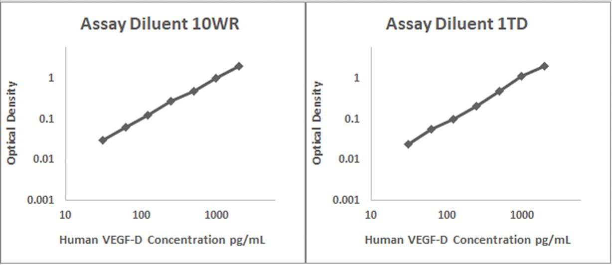 Human VEGF-D recombinant protein was spiked into various biological samples and serial diluted with Assay Diluent 10WR for serum and/or plasma samples and Assay Diluent 1TD for RPMI 10% FBS.