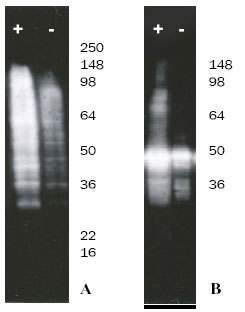 図1.S100ユビキチン結合アッセイによるウエスタンブロット結果 A)内在性HELA S100ライセート中の一般的なタンパク質のユビキチン化を、キットに含まれるUbiquitin-conjugate特異的抗体を用いて検出した。 B)外因的にp53を添加したHeLa S100ライセート中のp53の特異的修飾を、p53 抗体(品番:BML-PW1095-0025)用いて検出した。 これらの結果から、本キットは、内在性のS100ライセートタンパク質に対しても、p53のような関心の高い特定のタンパク質に対しても、ユビキチン化修飾を検出するのに有用であることが示唆された。また、ATP添加(+レーン)のアッセイでは、ATP未添加のコントロール(-レーン)に比べてユビキチンタンパク質レベルが高いことから、これらの修飾がATPに依存していることが示された。