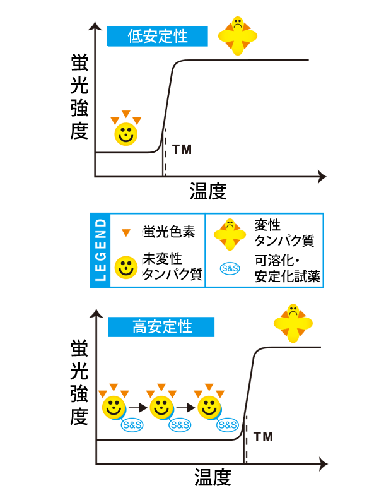 試薬の添加による安定性の変化をThermoFluorで測定 熱により変性したタンパク質に蛍光色素(Spyro Orange)が結合し蛍光強度が高くなることから、蛍光光度を測定することにより熱安定性の変化を検証できる。