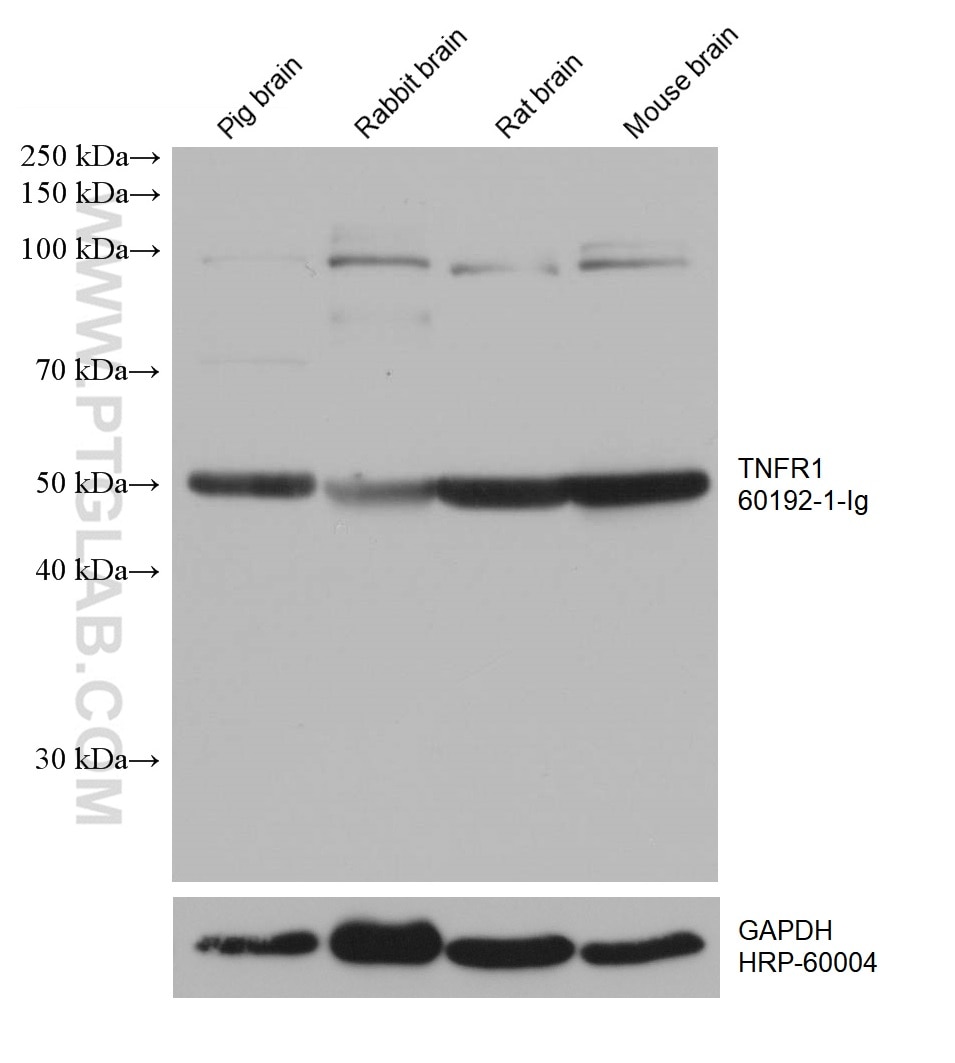 The TNFR1/CD120a antibody from Proteintech is a mouse monoclonal antibody to a recombinant protein of human TNFR1/CD120a. This antibody recognizes human, mouse, rat, pig antigen. The TNFR1/CD120a antibody has been validated for the following applications: WB, IHC, IF-P, ELISA analysis.
