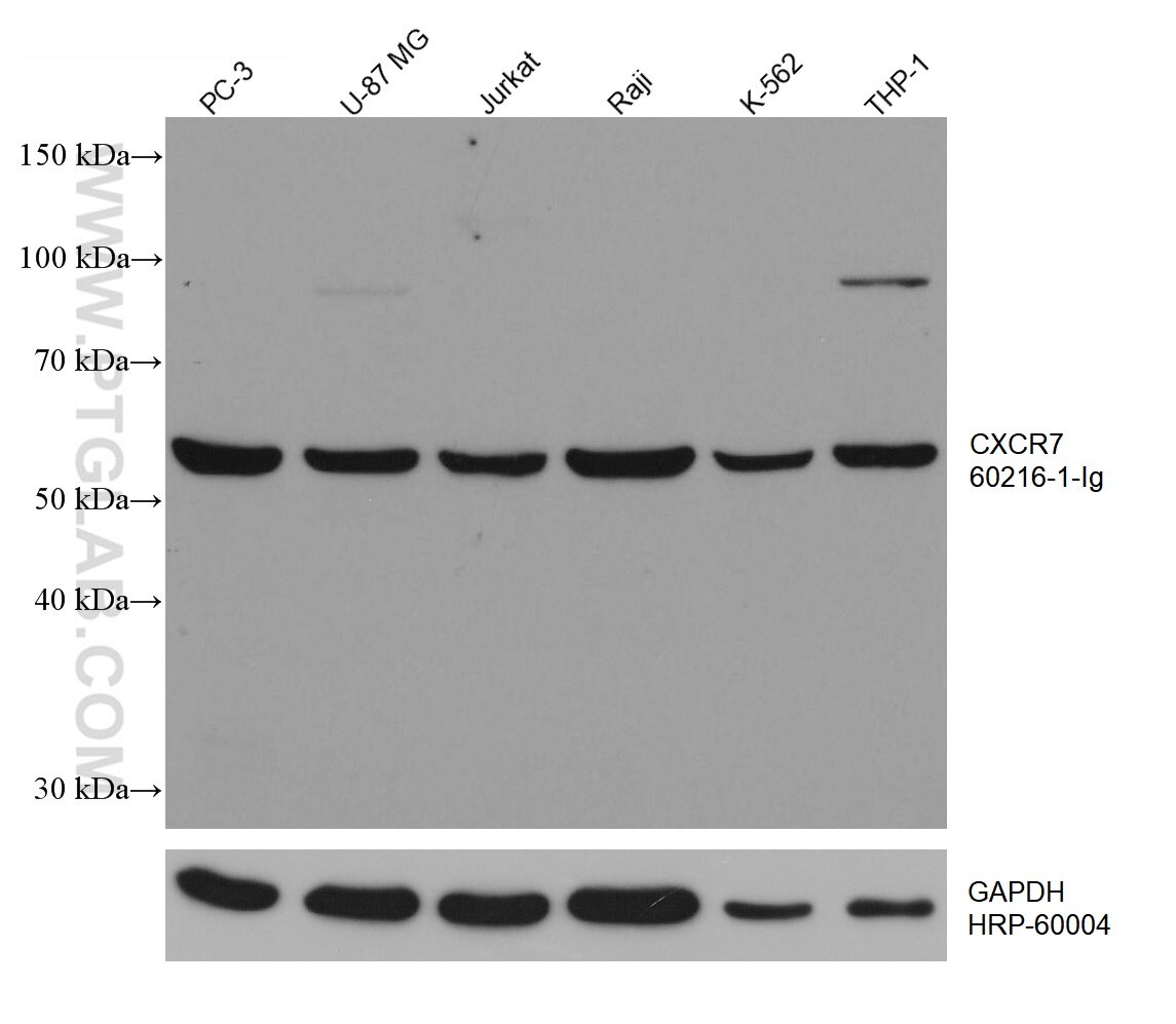 The CXCR7 antibody from Proteintech is a mouse monoclonal antibody to a recombinant protein of human CXCR7. This antibody recognizes human, mouse antigen. The CXCR7 antibody has been validated for the following applications: WB, IHC, IF-P, ELISA analysis.
