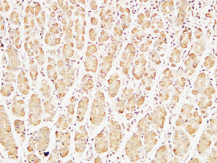 Immunohistochemical analysis of paraffin-embedded Human stomach. 1, Antibody was diluted at 1:400(4° overnight). 2, High-pressure and temperature EDTA, pH8.0 was used for antigen retrieval. 3,Secondary antibody was diluted at 1:200(room temperature, 30min).