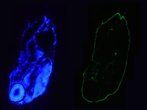 Figure 6: Immunofluorescence staining of a 5 days old zebrafish embryo. Left panel: DAPI-staining of cell nuclei, providing an overview of the tissue section used for immunostaining