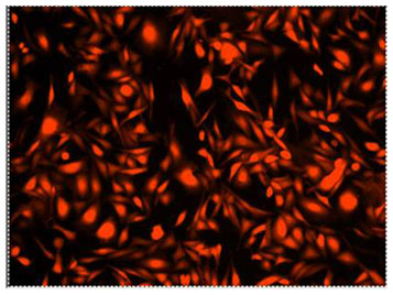 生細胞染色用キットです。疎水性の赤色蛍光色素は容易に細胞膜を通過し、生細胞内で強い蛍光を発します。蛍光顕微鏡、フローサイト、マイクロプレートアッセイ等の幅広いプラットフォームでご使用可能で、増殖/非増殖(浮遊/接着)の両細胞でお使いいただけます。細胞接着、走化性、多剤耐性、細胞生存、アポトーシス、細胞毒性等の研究に有用です。