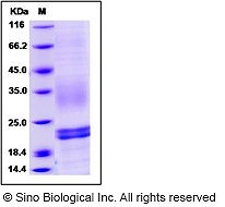 calculated molecular mass: 29.2 (14.3+14.9) KDa SDS-PAGE under reducing conditions: 20 and 22 KDa