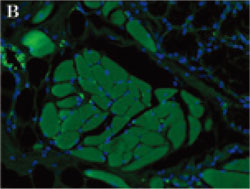 ヒト CD163 抗体 (品番:CL7617AP) パラホルムアルデヒド固定/パラフィン包埋 ヒト脾臓切片(A)、ヒト扁桃切片(B)を染色(400倍、DAPIで対比染色) 一次抗体:マウス 抗ヒト CD163 モノクローナル抗体(品番:CL7617AP、1:500 希釈)、二次抗体:Alexa Fluor 488 ヤギ 抗マウス抗体(1:500 希釈)
