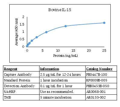 The Bovine IL-15 ELISA contains capture antibody, recombinant protein standard, and detection antibody for development of a Bovine IL-15 ELISA. The antibodies have been determined to function in an ELISA with the standard provided. Optimal buffers, concentrations, incubation times, incubation temperatures, and methods for the ELISA have not been determined. This allows for complete flexibility to provide optimal dynamic range and sensitivity based on your sample type. The Bovine IL-15 ELISA can also be used to measure Water Buffalo, Wild Yak, and Zebu IL-15. Alternate names include IL15, IL-15, interleukin 15. The quantities of components provided are not matched. Components may also be purchased separately. For research use only. Made in the USA