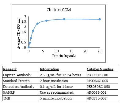 The Chicken CCL4 (MIP-1beta) ELISA contains capture antibody, recombinant protein standard, and detection antibody for development of a Chicken CCL4 ELISA. The antibodies have been determined to function in an ELISA with the standard provided. Optimal buffers, concentrations, incubation times, incubation temperatures, and methods for the ELISA have not been determined. This allows for complete flexibility to provide optimal dynamic range and sensitivity based on your sample type. Alternate names include CCL4L1, AT744.2, CCL4L, LAG-1, LAG1, SCYA4L, SCYA4L1, MIP-1-beta, SCYA4L2, C-C motif chemokine ligand 4 like 1. The quantities of components provided are not matched. Components may also be purchased separately. For research use only. Made in the USA