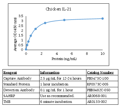The Chicken IL-21 ELISA contains capture antibody, standard, and detection antibody for development of a Chicken IL-21 ELISA. The antibodies have been determined to function in an ELISA with the standard provided. Optimal buffers, concentrations, incubation times, incubation temperatures, and methods for the ELISA have not been determined. This allows for complete flexibility to provide optimal dynamic range and sensitivity based on your sample type. Alternate names include IL21, CVID11, IL-21, Za11, interleukin 21. The quantities of components provided are not matched. Components may also be purchased separately. For research use only. Made in the USA