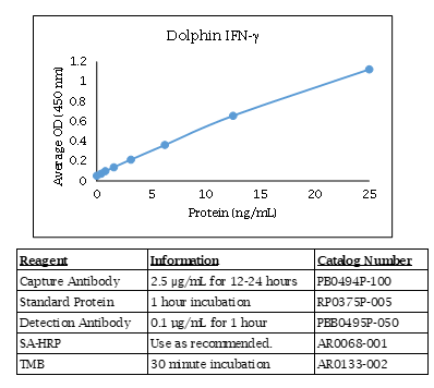 The Dolphin IFN gamma ELISA contains capture antibody, standard, and detection antibody for development of a Dolphin IFN gamma ELISA. The antibodies have been determined to function in an ELISA with the standard provided. Optimal buffers, concentrations, incubation times, incubation temperatures, and methods for the ELISA have not been determined. This allows for complete flexibility to provide optimal dynamic range and sensitivity based on your sample type. Alternate names include IFNG, IFG, IFI, interferon, gamma, interferon gamma. The quantities of components provided are not matched. Components may also be purchased separately. For research use only. Made in the USA