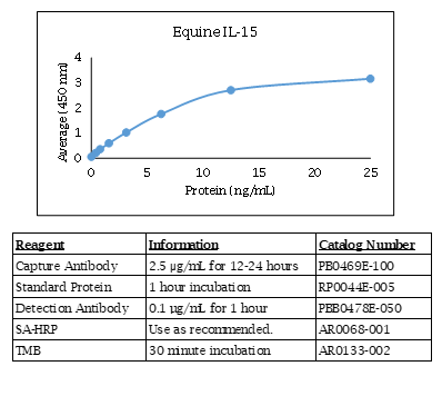 The Equine IL-15 ELISA contains capture antibody, standard, and detection antibody for development of a Equine IL-15 ELISA. The antibodies have been determined to function in an ELISA with the standard provided. Optimal buffers, concentrations, incubation times, incubation temperatures, and methods for the ELISA have not been determined. This allows for complete flexibility to provide optimal dynamic range and sensitivity based on your sample type. Alternate names include IL15, IL-15, interleukin 15. The quantities of components provided are not matched. Components may also be purchased separately. For research use only. Made in the USA