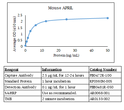 The Mouse APRIL ELISA contains capture antibody, standard, and detection antibody for development of a Mouse APRIL ELISA. The antibodies have been determined to function in an ELISA with the standard provided. Optimal buffers, concentrations, incubation times, incubation temperatures, and methods for the ELISA have not been determined. This allows for complete flexibility to provide optimal dynamic range and sensitivity based on your sample type. Alternate names include TNFSF13, APRIL, CD256, TALL-2, TALL2, TRDL-1, ZTNF2, UNQ383/PRO715, TNLG7B, tumor necrosis factor superfamily member 13, TNF superfamily member 13. The quantities of components provided are not matched. Components may also be purchased separately. For research use only. Made in the USA