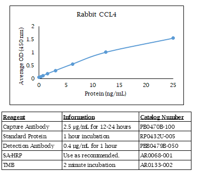 The Rabbit CCL4 (MIP-1beta) ELISA contains capture antibody, protein standard, and detection antibody for development of a Rabbit CCL4 ELISA. The antibodies have been determined to function in an ELISA with the standard provided. Optimal buffers, concentrations, incubation times, incubation temperatures, and methods for the ELISA have not been determined. This allows for complete flexibility to provide optimal dynamic range and sensitivity based on your sample type. Alternate names include CCL4L1, AT744.2, CCL4L, LAG-1, LAG1, SCYA4L, SCYA4L1, MIP-1-beta, SCYA4L2, C-C motif chemokine ligand 4 like 1. The quantities of components provided are not matched. Components may also be purchased separately. For research use only. Made in the USA