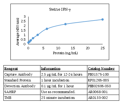 The Swine IFN gamma ELISA contains capture antibody, standard, and detection antibody for development of a Swine IFN gamma ELISA. The antibodies have been determined to function in an ELISA with the standard provided. Optimal buffers, concentrations, incubation times, incubation temperatures, and methods for the ELISA have not been determined. This allows for complete flexibility to provide optimal dynamic range and sensitivity based on your sample type. Alternate names include IFNG, IFG, IFI, interferon, gamma, interferon gamma. The quantities of components provided are not matched. Components may also be purchased separately. For research use only. Made in the USA