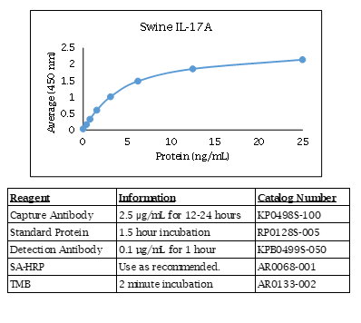 The Swine IL-17A ELISA contains capture antibody, standard, and detection antibody for development of a Swine IL-17A ELISA. The antibodies have been determined to function in an ELISA with the standard provided. Optimal buffers, concentrations, incubation times, incubation temperatures, and methods for the ELISA have not been determined. This allows for complete flexibility to provide optimal dynamic range and sensitivity based on your sample type. Alternate names include IL17A, CTLA8, IL-17, IL-17A, IL17, CTLA-8, interleukin 17A. The quantities of components provided are not matched. Components may also be purchased separately. For research use only. Made in the USA
