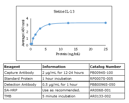 The Swine IL-13 polyclonal antibody is unlabeled and has been qualified for use in ELISA and Western blot applications. The Swine IL-13 polyclonal antibody was produced in goats and is antigen-affinity purified. The reactivity by species is: (Bovine IL-13 - Moderate) (Canine IL-13 - Weak) (Chicken IL-13 - None) (Equine IL-13 - Weak) (Mouse IL-13 - Weak) (Swine IL-13 - Strong). For research use only. Made in the USA
