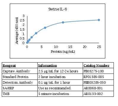 The Swine IL-6 polyclonal antibody is unlabeled and has been qualified for use in ELISA and Western blot applications. It is the capture antibody in the Kingfisher Biotech Swine IL-6 ELISA. The Swine IL-6 polyclonal antibody was produced in rabbits and is antigen-affinity purified. The reactivity by species is: (Bovine IL-6 - None) (Canine IL-6 - None) (Chicken IL-6 - None) (Cynomolgus Monkey IL-6 - None) (Equine IL-6 - None) (Feline IL-6 - Weak) (Human IL-6 - None) (Mouse IL-6 - None) (Ovine IL-6 - None) (Swine IL-6 - Strong). For research use only. Made in the USA