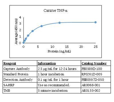 The Canine TNF alpha polyclonal antibody is labeled and has been qualified for use in ELISA. It is the detection antibody in the Kingfisher Biotech Canine TNF alpha ELISA. The Canine TNF alpha polyclonal antibody was produced in goats and is antigen-affinity purified. The reactivity by species is: (Bovine TNFalpha - None) (Canine TNFalpha - Strong) (Caprine TNFalpha - None) (Cynomolgus Monkey TNFalpha - Strong) (Dolphin TNFalpha - None) (Equine TNFalpha - Weak) (Feline TNFalpha - Moderate) (Guinea Pig TNFalpha - None) (Human TNFalpha - Strong) (Mouse TNFalpha - None) (Ovine TNFalpha - None) (Rabbit TNFalpha - Moderate) (Swine TNFalpha - None). For research use only. Made in the USA