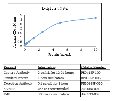 The Dolphin TNF alpha polyclonal antibody is labeled and has been qualified for use in ELISA. It is the detection antibody in the Kingfisher Biotech Dolphin TNF alpha ELISA. The Dolphin TNF alpha polyclonal antibody was produced in goats and is antigen-affinity purified. The reactivity by species is: (Bovine TNF-alpha - Weak) (Canine TNF-alpha - None) (Caprine TNF-alpha - None) (Cynomolgus Monkey TNF-alpha - None) (Dolphin TNF-alpha - Strong) (Equine TNF-alpha - None) (Feline TNF-alpha - None) (Guinea Pig TNF-alpha - None) (Human TNF-alpha - None) (Mouse TNF-alpha - None) (Ovine TNF-alpha - None) (Rabbit TNF-alpha - Weak) (Swine TNF-alpha - Weak). For research use only. Made in the USA