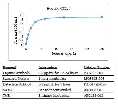 The Bovine CCL4 (MIP-1 beta) polyclonal antibody is labeled and has been qualified for use in ELISA. It is the detection antibody in the Kingfisher Biotech Bovine CCL4 ELISA. The Bovine CCL4 polyclonal antibody was produced in goats and is antigen-affinity purified. The reactivity by species is: (Bovine CCL4 - Strong) (Canine CCL4 - Strong) (Chicken CCL4 - None) (Equine CCL4 - Moderate) (Human CCL4 - Moderate) (Mouse CCL4 - None) (Rabbit CCL4 - Strong) (Rat CCL4 - Strong) (Swine CCL4 - Strong). For research use only. Made in the USA