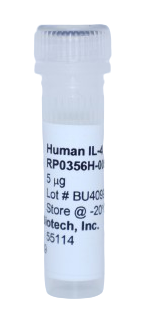 The Human IL-4 yeast-derived recombinant protein is not tagged and is naturally endotoxin-free. The purity is greater than 98% as visualized by SDS-PAGE analysis. Human IL-4 applications are for cell culture, ELISA standard, and Western Blot Control. The Human IL-4 yeast-derived recombinant protein can be purchased in multiple sizes. Human IL-4 Specifications: (Molecular Weight: 15.0 kDa) (Amino Acid Sequence: HKCDITLQEI IKTLNSLTEQ KTLCTELTVT DIFAASKNTT EKETFCRAAT VLRQFYSHHE KDTRCLGATA QQFHRHKQLI RFLKRLDRNL WGLAGLNSCP VKEANQSTLE NFLERLKTIM REKYSKCSS (129)) (Gene ID: 3565). For research use only. Made in the USA