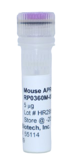 The Mouse APRIL yeast-derived recombinant protein is not tagged and is naturally endotoxin-free. The purity is greater than 98% as visualized by SDS-PAGE analysis. Mouse APRIL applications are for cell culture, ELISA standard, and Western Blot Control. The Mouse APRIL yeast-derived recombinant protein can be purchased in multiple sizes. Mouse APRIL Specifications: (Molecular Weight: 16.4 kDa) (Amino Acid Sequence: AVLTQKHKKKHSVLHLVPVNITSKADSDVTEVMWQPVLRRGRGLEAQGDIVRVWDTGIYLLYSQVLFHDVTFTMGQVVSREGQGRRETLFRCIRSMPSDPDRAYNSCYSAGVFHLHQGDIITVKIPRANAKLSLSPHGTFLGFVKL (146)) (Gene ID: 69583). For research use only. Made in the USA