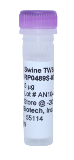 The Swine TWEAK yeast-derived recombinant protein is not tagged and is naturally endotoxin-free. The purity is greater than 98% as visualized by SDS-PAGE analysis. Swine TWEAK applications are for cell culture, ELISA standard, and Western Blot Control. The Swine TWEAK yeast-derived recombinant protein can be purchased in multiple sizes. Swine TWEAK Specifications: (Molecular Weight: 17.3 kDa) (Amino Acid Sequence: SAPKGRKPRA RRVIAAHYEV HPRPGQDGAQ AGVDGTVSGW EEAKINSSNP LRYDRQSGQF LVTRAGLYYL YCQVHFDEGK AVYLKLDLLV DDTLALRCLE EFSATAASSL GPQLRLCQVS GLLPLRPGSS LRIRTLPWAH LKAAPFLTYF GLFQVH (156)) (Gene ID: 100127163). For research use only. Made in the USA