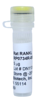 The Rat RANKL yeast-derived recombinant protein is not tagged and is naturally endotoxin-free. The purity is greater than 98% as visualized by SDS-PAGE analysis. Rat RANKL applications are for cell culture, ELISA standard, and Western Blot Control. The Rat RANKL yeast-derived recombinant protein can be purchased in multiple sizes. Rat RANKL Specifications: (Molecular Weight: 19.8 kDa) (Amino Acid Sequence: FSGVPAMMEG SWLDVARRGK PEAQPFAHLT INAANIPSGS HKVSLSSWYH DRGWAKISNM TLSNGKLRVN QDGFYYLYAN ICFRHHETSG SVPADYLQLM VYVVKTSIKI PSSHNLMKGG STKNWSGNSE FHFYSINVGG FFKLRAGEEI SVQVSNPSLL DPDQDATYFG AFKVQDID (178)) (Gene ID: 117516). For research use only. Made in the USA