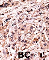 Formalin-fixed and paraffin-embedded human cancer tissue reacted with TP53 (phospho S20) polyclonal antibody (Cat # PAB0561) which was peroxidase-conjugated to the secondary antibody followed by AEC staining. This data demonstrates the use of this antibody for immunohistochemistry; clinical relevance has not been evaluated. BC = breast carcinoma.