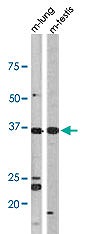 Western blot analysis of TP53 (phospho T18) polyclonal antibody (Cat # PAB0568) in mouse lung (left), mouse testis (right) tissue lysates. Phospho-TP53-T18 (arrow) was detected using the purified polyclonal antibody.