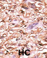 Formalin-fixed and paraffin-embedded human hepatocellular carcinoma tissue reacted with TP53 (phospho T18) polyclonal antibody (Cat # PAB0568) which was peroxidase-conjugated to the secondary antibody followed by AEC staining. This data demonstrates the use of this antibody for immunohistochemistry; clinical relevance has not been evaluated. HC = hepatocarcinoma.