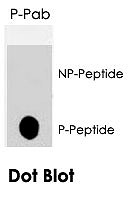 Dot blot analysis of TP53 (phospho T18) polyclonal antibody (Cat # PAB0568) on nitrocellulose membrane. 50 ng of Phospho-peptide or Non Phospho-peptide per dot were adsorbed.