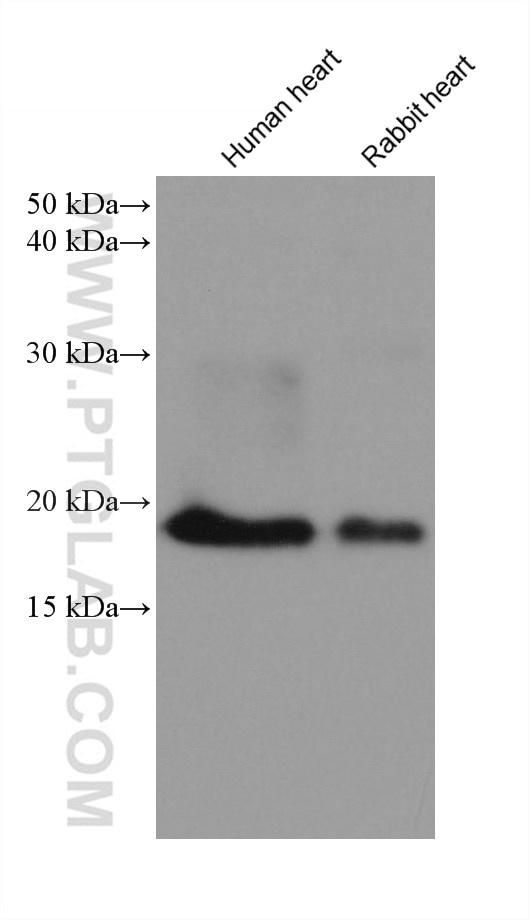 The Myosin Light Chain 2/MLC-2V antibody from Proteintech is a mouse monoclonal antibody to a recombinant protein of human Myosin Light Chain 2/MLC-2V. This antibody recognizes human, mouse, rat, pig, rabbit antigen. The Myosin Light Chain 2/MLC-2V antibody has been validated for the following applications: WB, IHC, IF/ICC, ELISA analysis.