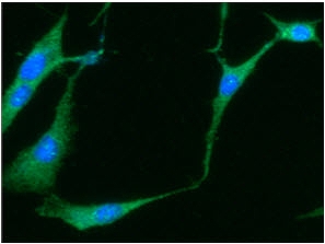 ICC/IF analysis of NSE in U87MG cells line, stained with DAPI (Blue) for nucleus staining and monoclonal anti-human NSE antibody (1:100) with goat anti-mouse IgG-Alexa fluor 488 conjugate (Green).