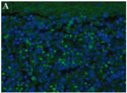 ヒト CD35 抗体 (品番:CL7614AP) パラホルムアルデヒド固定・パラフィン包埋 ヒト脾臓(A)、ヒト扁桃腺(B)をAlexa Fluor 488にて染色(400倍、DAPIで対比染色) 一次抗体:マウス 抗ヒト CD35 モノクローナル抗体(品番:CL7614AP、1:500 で希釈)、二次抗体Alexa Fluor 488 ヤギ 抗マウス抗体(1:500 で希釈)