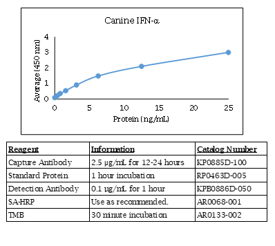 The Canine IFN alpha ELISA contains capture antibody, standard, and detection antibody for development of a Canine IFN alpha ELISA. The antibodies have been determined to function in an ELISA with the standard provided. Optimal buffers, concentrations, incubation times, incubation temperatures, and methods for the ELISA have not been determined. This allows for complete flexibility to provide optimal dynamic range and sensitivity based on your sample type. The Canine IFN alpha ELISA can also be used to measure Dingo IFN alpha. The quantities of components provided are not matched. Components may also be purchased separately. For research use only. Made in the USA